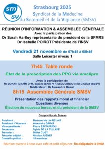 A l’occasion du congrès national du sommeil se déroulera comme chaque année notre réunion d’information, suivie de l’Assemblée Générale du SMSV.